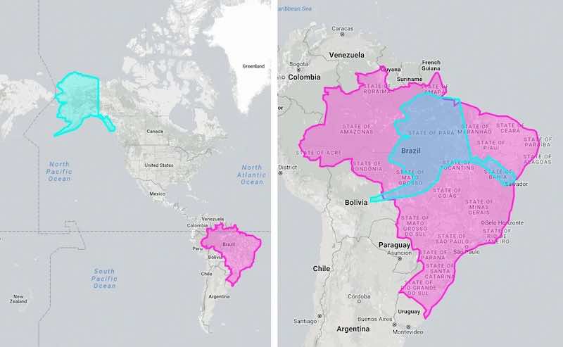 - Most maps of the world you see are incorrect. On most maps, the Mercator projection – first developed in 1569 – is still used. This method has been very inaccurate. This method makes Alaska appear as large as Brazil while in realty Brazil is 5 times larger than Alaska in area.